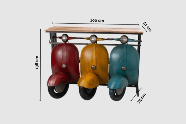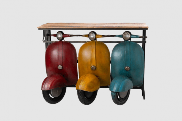 La Taula Bar Vintage Vespa és una peça icònica i decorativa que aporta personalitat a qualsevol espai. Inspirada en l’estil retro de les clàssiques scooters italianes, combina originalitat, funcionalitat i un toc vintage irresistible.