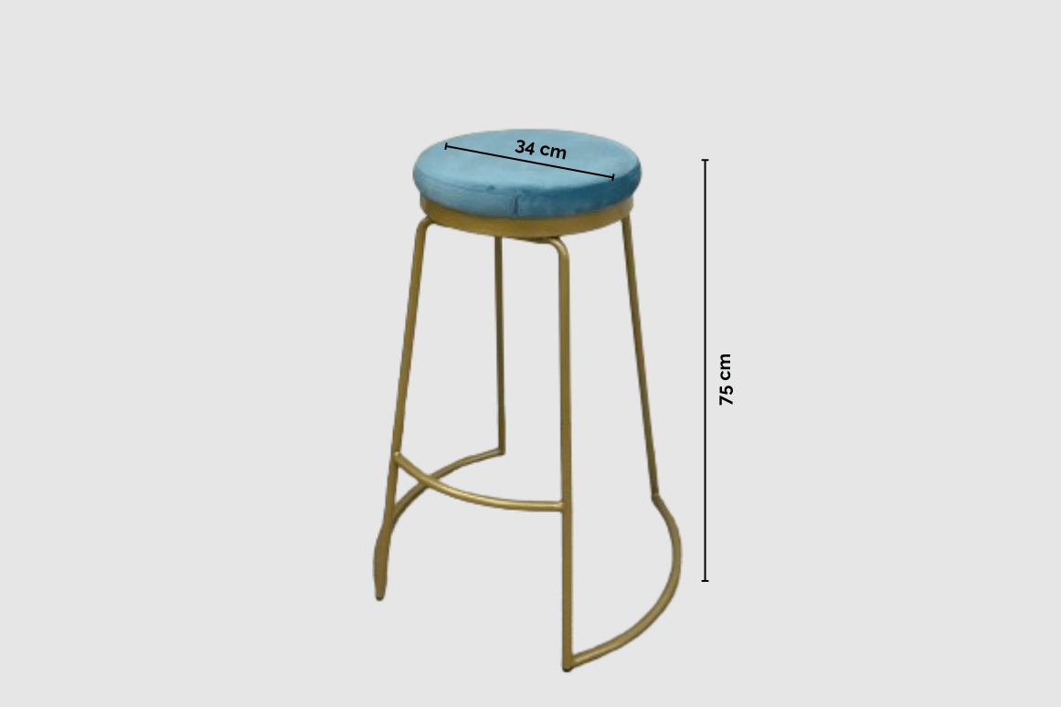 Tamboret elegant amb una estructura de metall daurada i seient rodó entapissat amb tela blava, perfecte per ambients moderns i sofisticats
