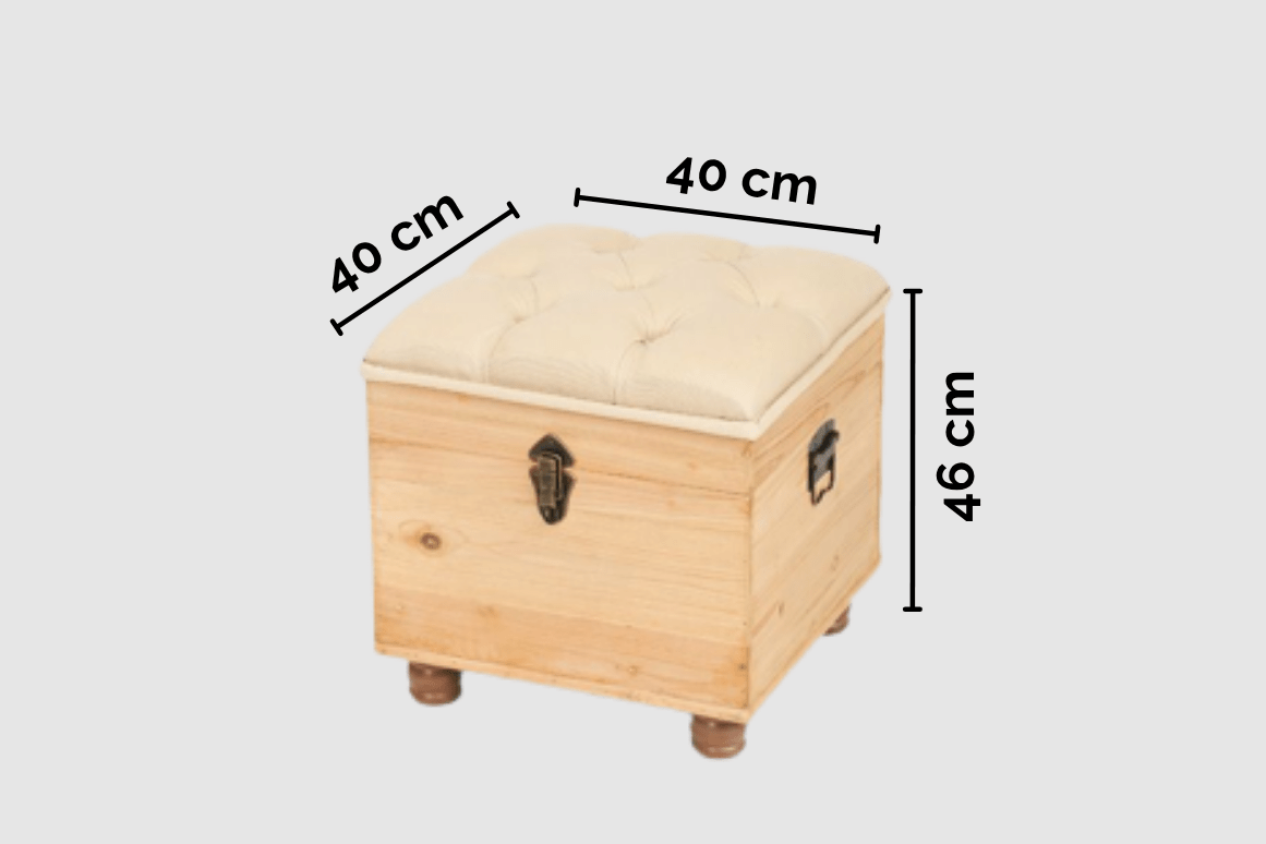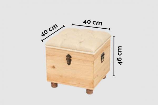 Puff d’estil vintage de fusta color torrat i seient encoixinat de lli. Ideal per donar-li encant a qüalsevol racó.