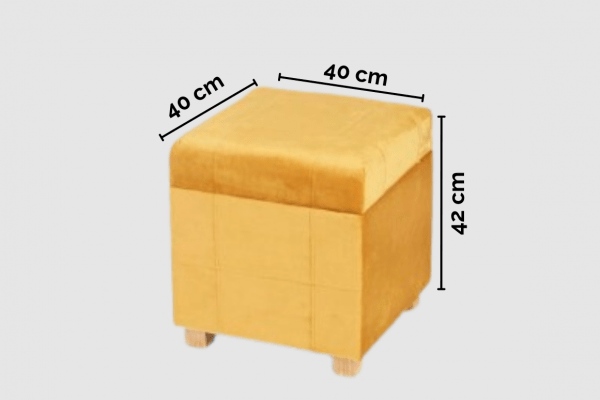 Puff vellutat cru, amb estructura interna de fusta. Coixí integrat en seient i amb bagul intern.