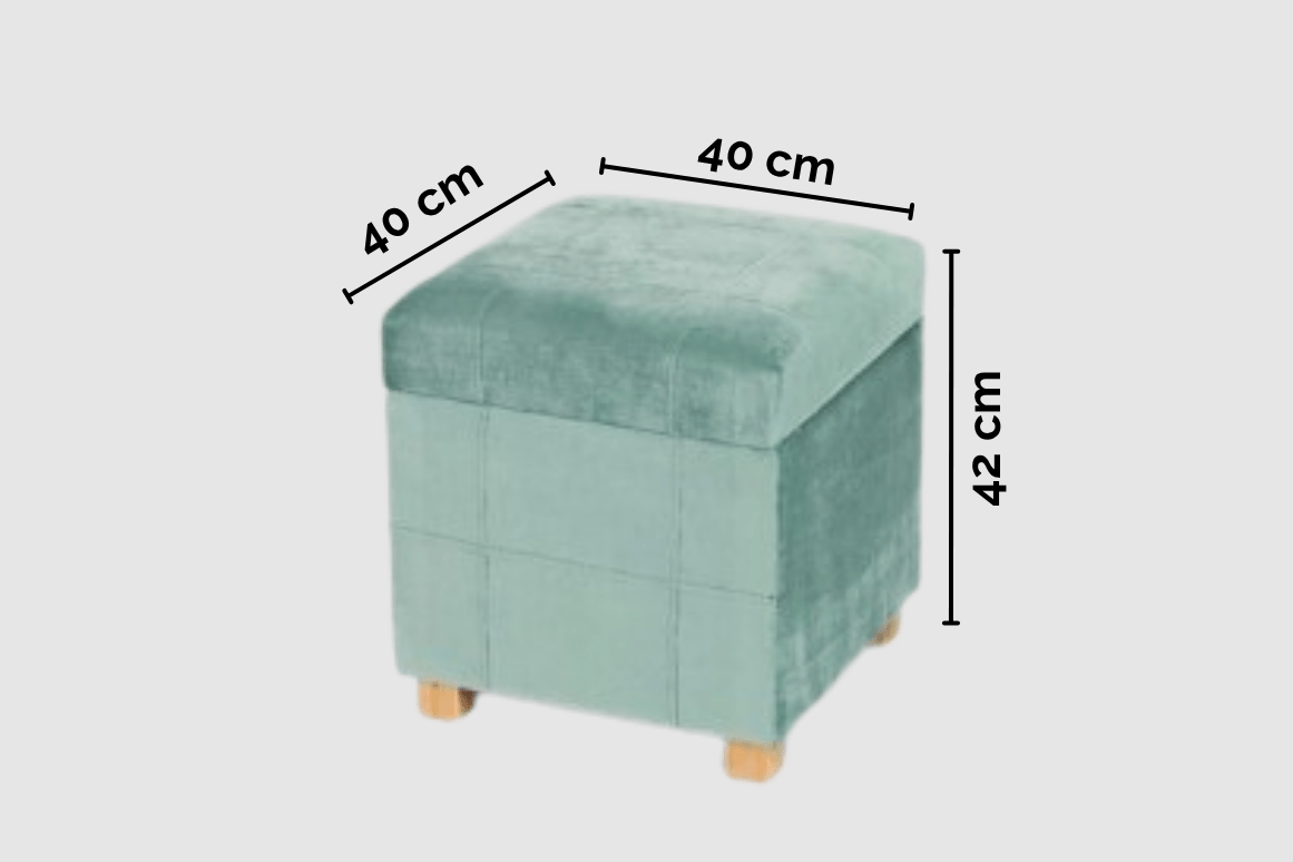 Puff vellutat verd aigua, amb estructura interna de fusta. Coixí integrat en seient i amb bagul intern.