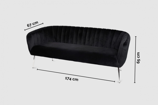 Sofà encoixinat de vellut negre amb potes d’acer, un contrast elegant i modern.