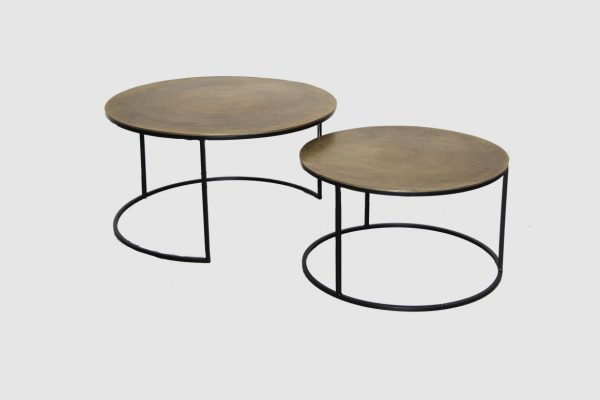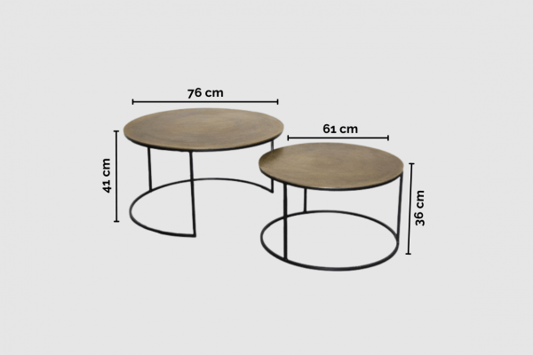 Set de 2 taules rodones amb acabats daurats i base negra, modern i el·legant.