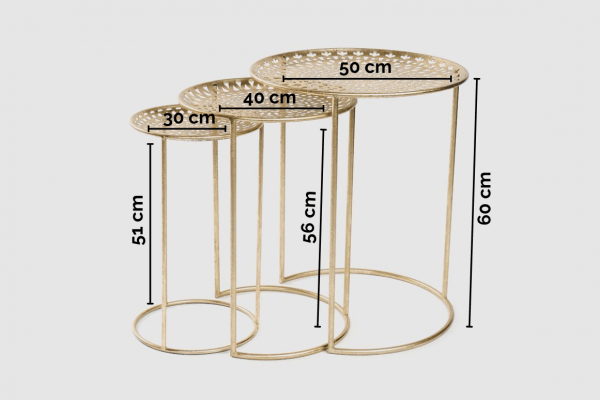 Set de taules metàl·liques daurades, perfectes per combinar amb un chill out en les seves diferents posicions.