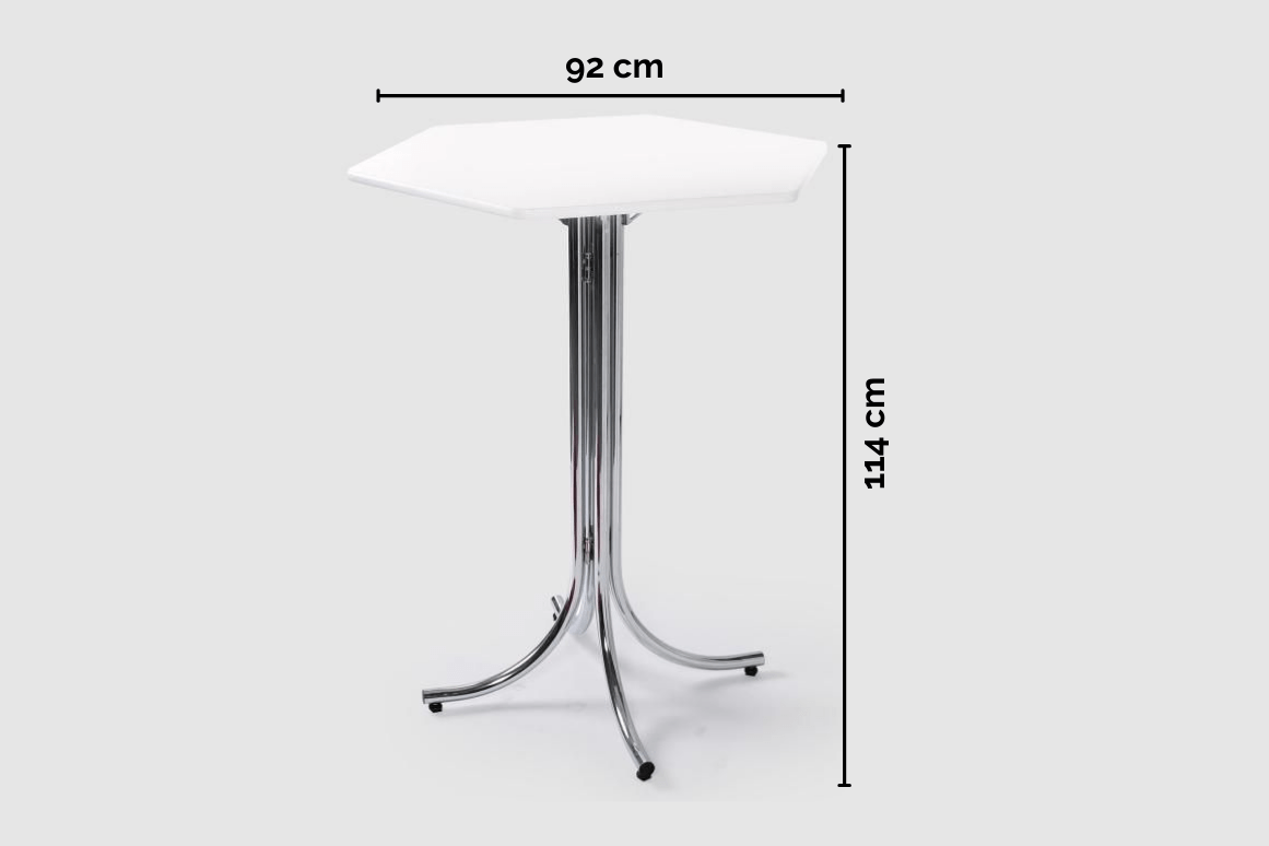 Taula alta de disseny hexagonal, d’estil senzill i el·legant. Ideal per a esdeveniments o festes.
