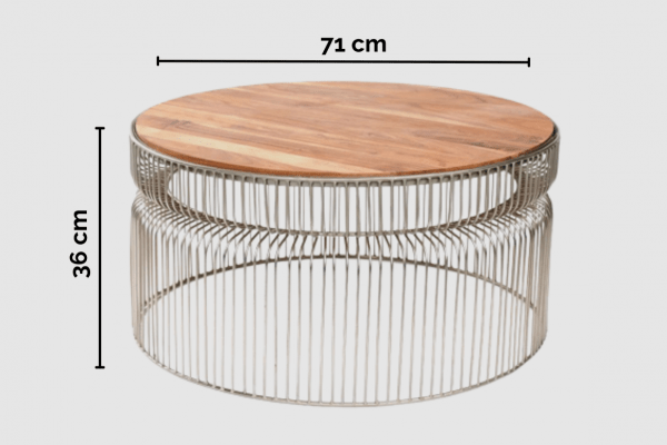 Taula de centre estil modern amb inspiracions vintage de fusta natural i color Níquel amb base de metall daurada. Perfecta per un toc modern i el·legant.