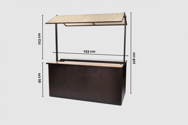 Wrought iron structure and metal lining, with textile cover and lighting. Includes kitchen area to place induction hob, fryer, barbecue and iron.