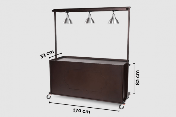 Iron display buffet trolley with wheels and built-in lighting with wrought iron skirt.