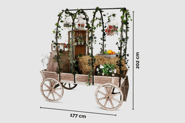 Vintage wooden cart with decorative wheels, with different country elements. A unique and perfect product for events or thematic decorations.