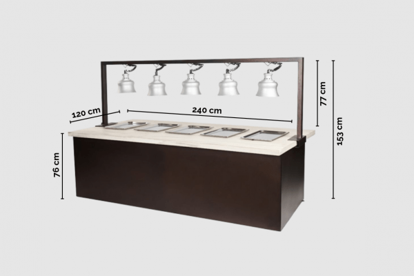 Pickled wooden table with copper forging structure with five adjustable thermal lights, perfect for maintaining the temperature of the buffet food.