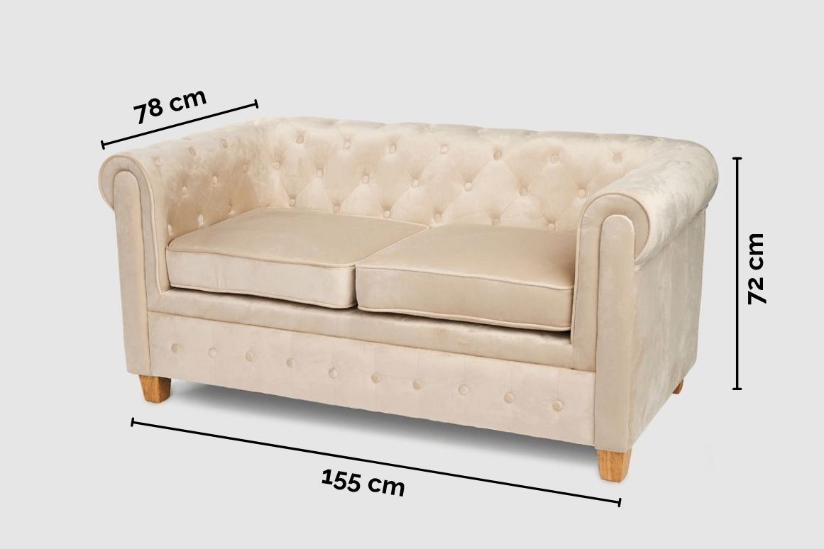 Beige two-seater velvety chester sofa. Internal wooden structure with integrated seat and back cushion. Perfect to combine with the other Chester sofas.