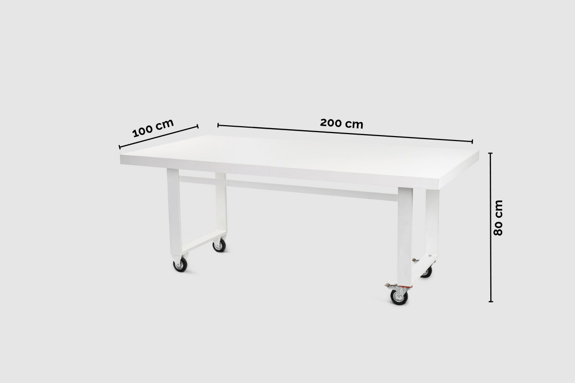 Melamine top with white iron structure and wheels. A versatile table perfect for different occasions.