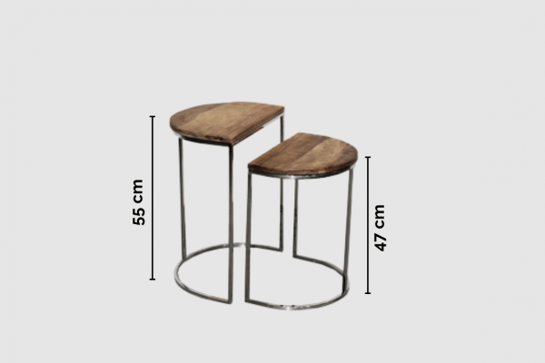 Set of half-moon tables with metal base and wooden top, ideal for modern and versatile spaces
