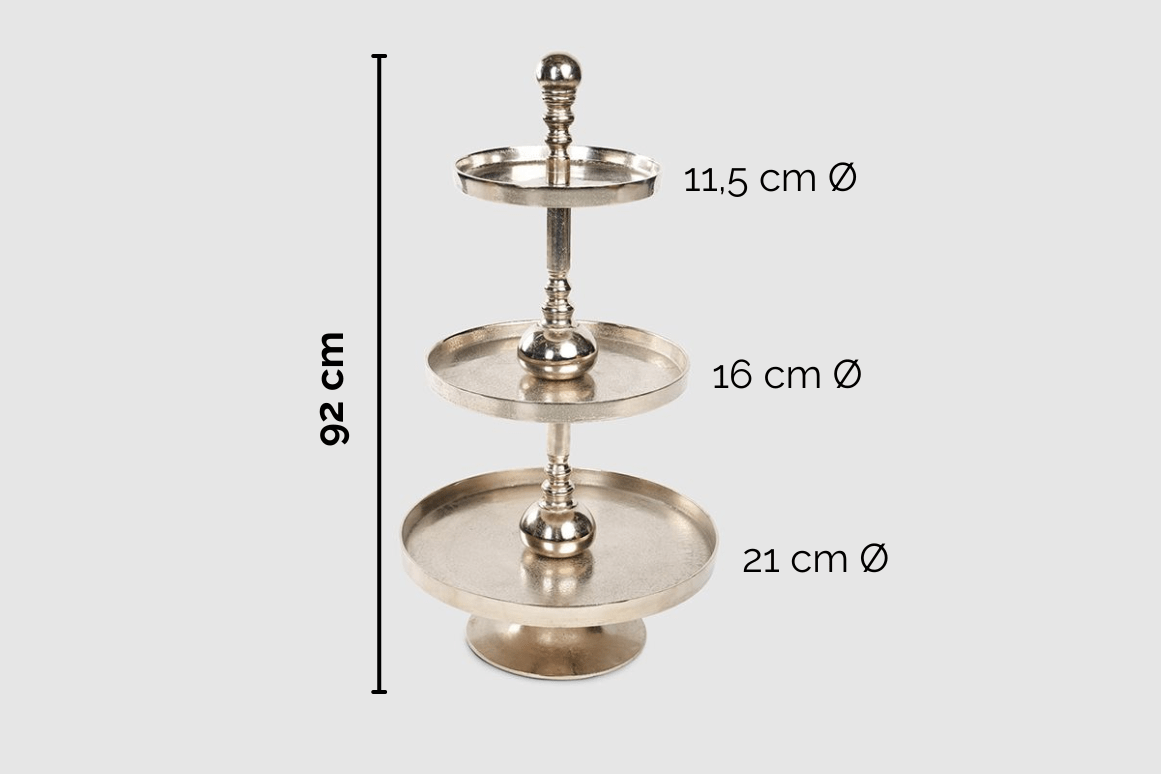 Su combinación de colores dorado y metalizado le confiere un aspecto moderno y sofisticado, ideal para ambientes contemporáneos. El diseño de tres niveles ofrece una presentación dinámica, lo que lo convierte en una pieza llamativa en cualquier buffet.