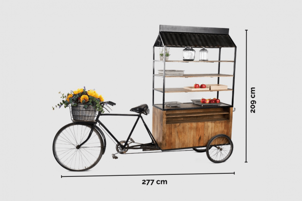 Bicicleta antigua y carretilla decorativo con tejadillo y ruedas, de estructura de hierro negro y madera natural con acabado rústico.