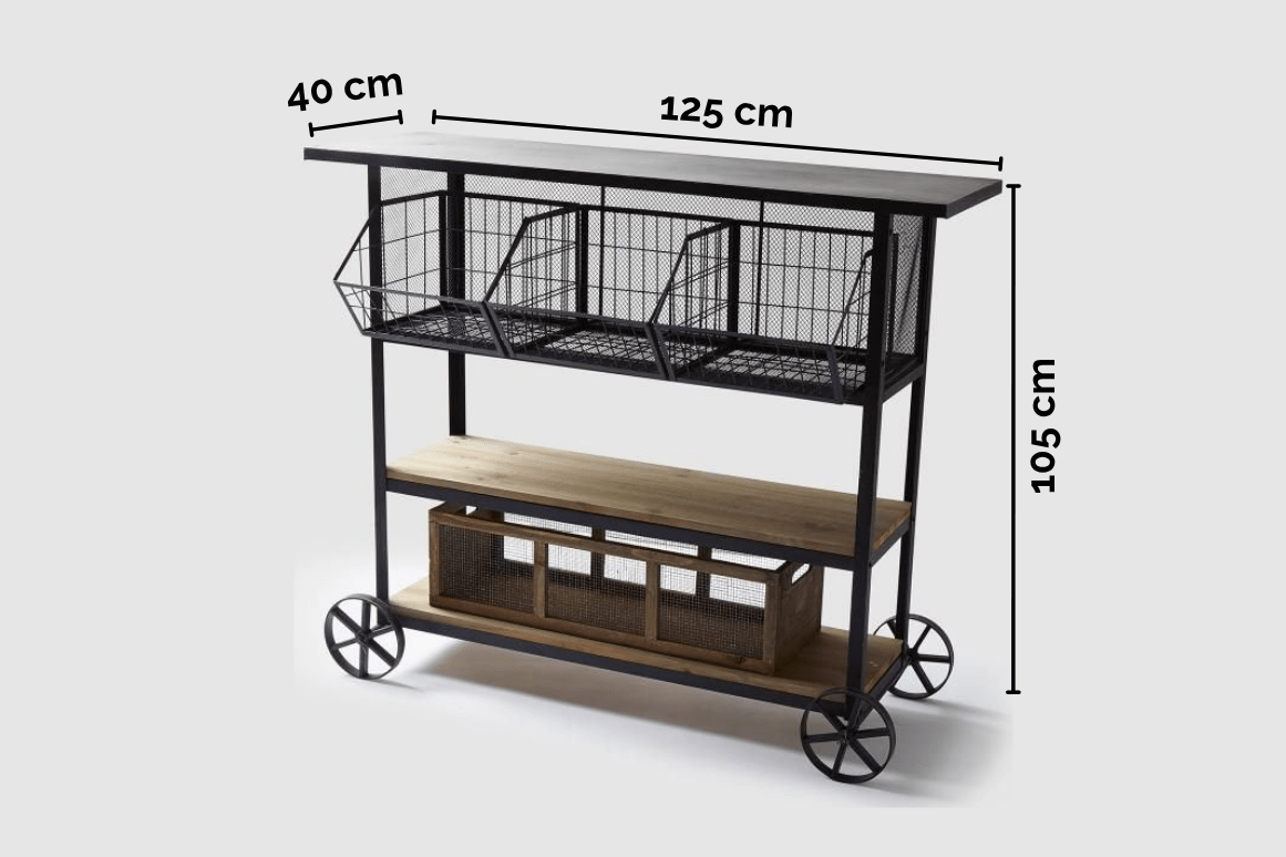 Carro frutero de forja con ruedas ideal para barra de frutas o como mesa de decoración. Perfecto para bodas o ceremonias al aire libre