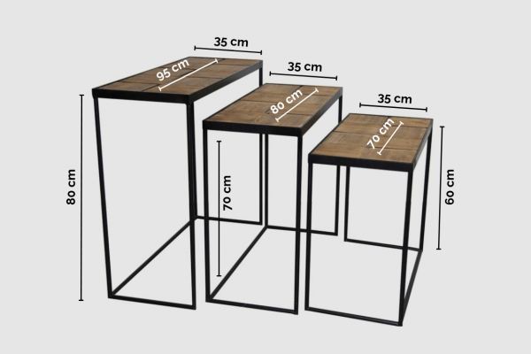 Mesas auxiliares estilo industrial con base de metal negro y superficie de madera rústica, perfectas para decorar y funcionales en cualquier espacio.