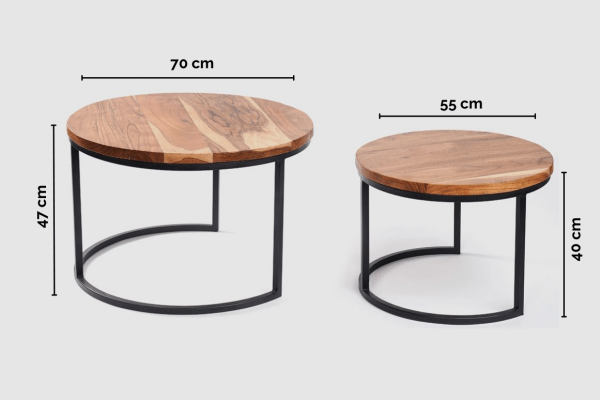 Set de mesas de hierro y madera con distintas modalidades de disposición. Desprenden simpleza y elegancia con su diseño